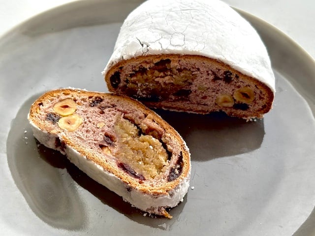 ヘーゼルナッツ、ホワイトチョコ、栗のマジパンが入ったベリー尽くしの贅沢なシュトレン。